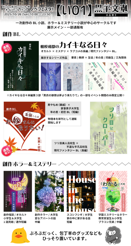 2025年10月25日(土)10:00〜23:00にピクリエで開催されるオールジャンルイベント『ノベフェスタ!』に『黑羊文庫』で参加します。